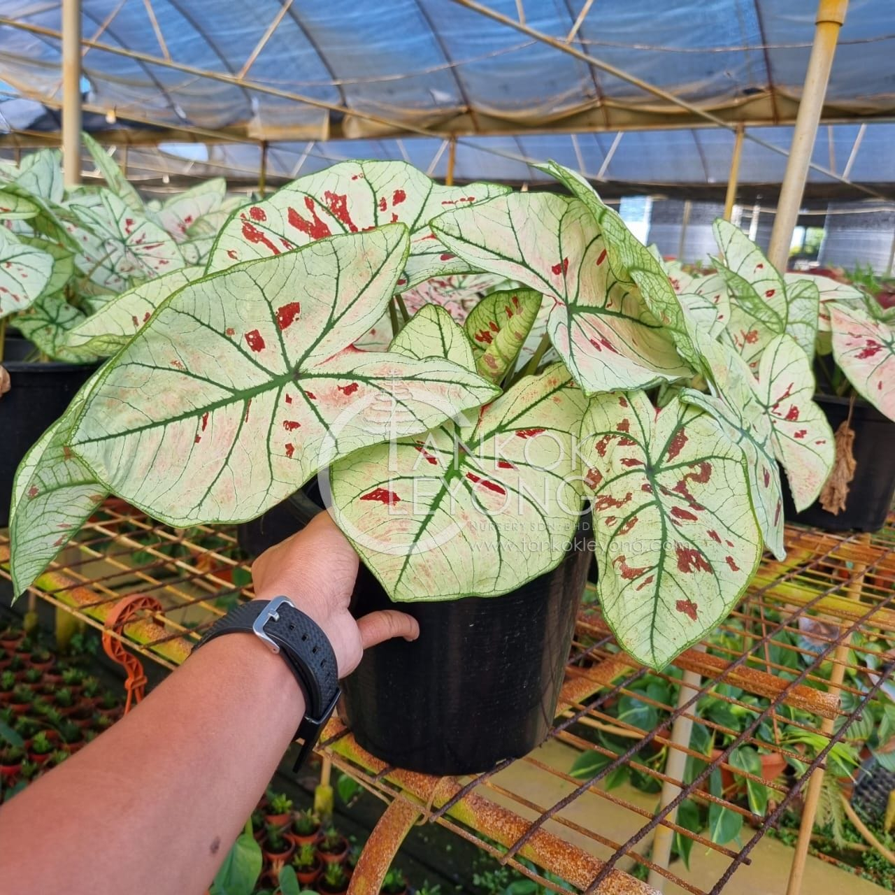 Description: Caladiums are tropical perennials that have almost unparalleled foliage and make showy houseplants. They have large, arrow-shaped and paper-thin leaves that come in a striking array of colors and patterns. A mass of caladium is an explosion of whites, greens, reds, and pinks that are mottled, veined, and striped. They can easily give you the visual impact of flowers while only being foliage plants.