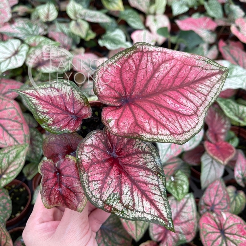 Description: Caladiums are tropical perennials that have almost unparalleled foliage and make showy houseplants. They have large, arrow-shaped and paper-thin leaves that come in a striking array of colors and patterns. A mass of caladium is an explosion of whites, greens, reds, and pinks that are mottled, veined, and striped. They can easily give you the visual impact of flowers while only being foliage plants.