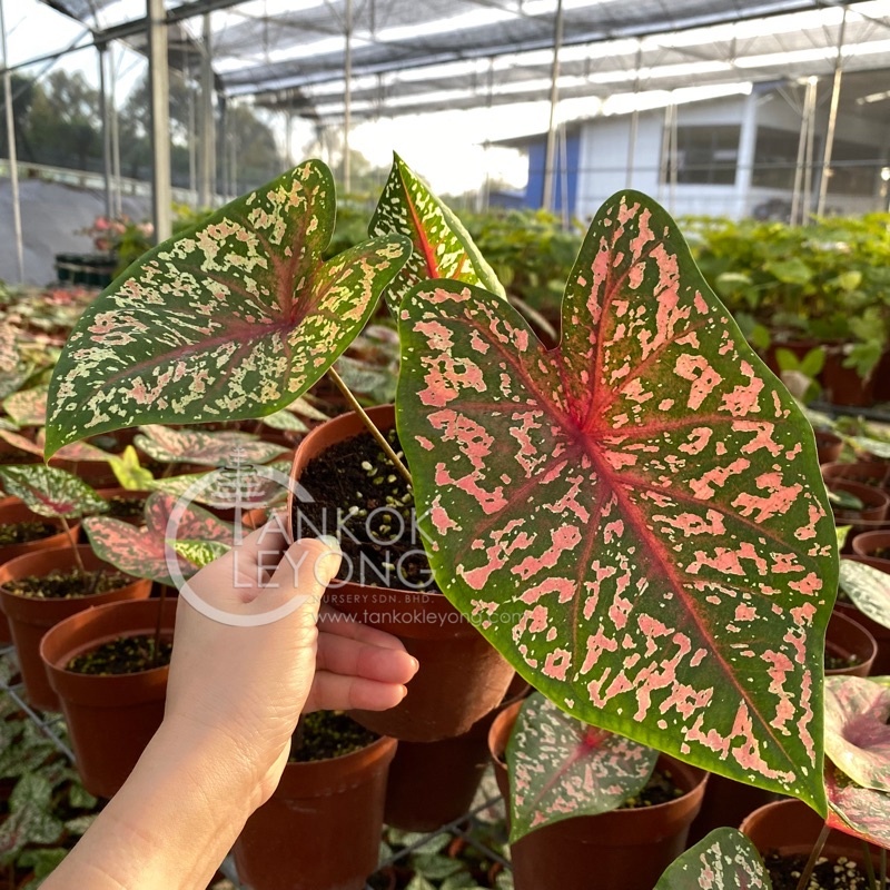 Description: Caladiums are tropical perennials that have almost unparalleled foliage and make showy houseplants. They have large, arrow-shaped and paper-thin leaves that come in a striking array of colors and patterns. A mass of caladium is an explosion of whites, greens, reds, and pinks that are mottled, veined, and striped. They can easily give you the visual impact of flowers while only being foliage plants.