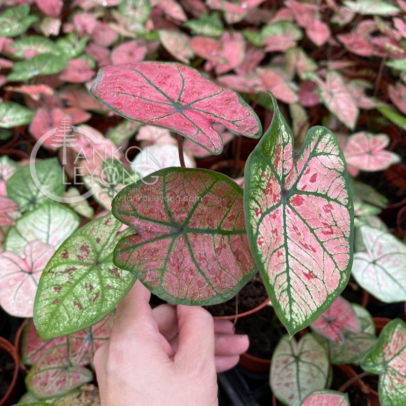 Description: Caladiums are tropical perennials that have almost unparalleled foliage and make showy houseplants. They have large, arrow-shaped and paper-thin leaves that come in a striking array of colors and patterns. A mass of caladium is an explosion of whites, greens, reds, and pinks that are mottled, veined, and striped. They can easily give you the visual impact of flowers while only being foliage plants.